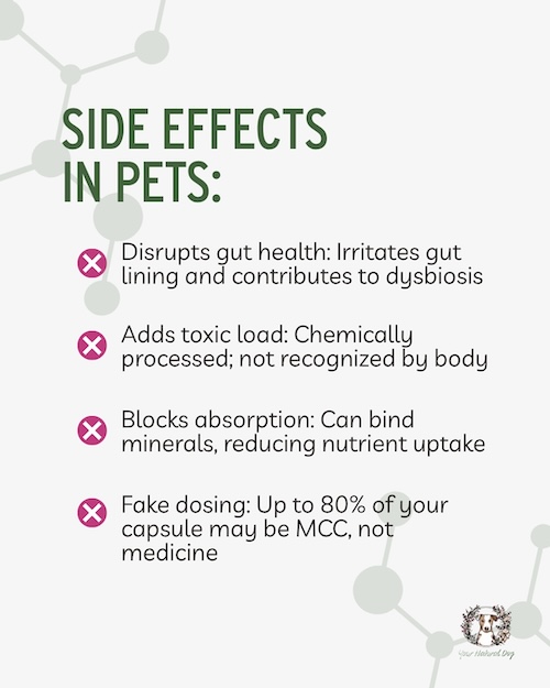Although MCC is listed as “generally recognized as safe” (GRAS) by the FDA, that doesn’t mean it’s risk-free. Especially when it’s used daily, or given to animals with existing sensitivities, inflammation, or chronic disease.