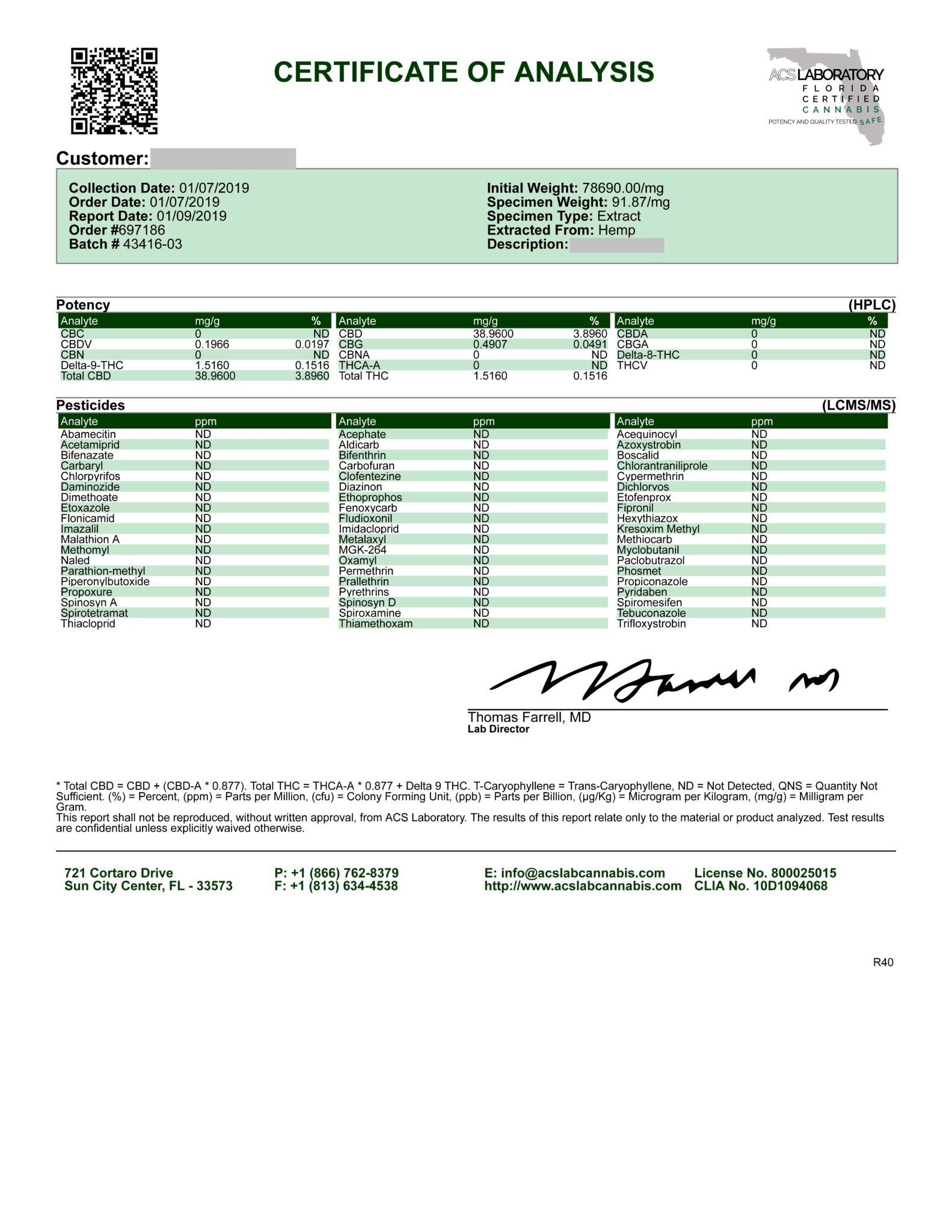 For example, here is a lab certificate below. You can see the number of cannabinoids and absence of pesticides in the sample from the batch. Transparency is the goal, and through third-party lab testing, a company is able to stand behind their claims.